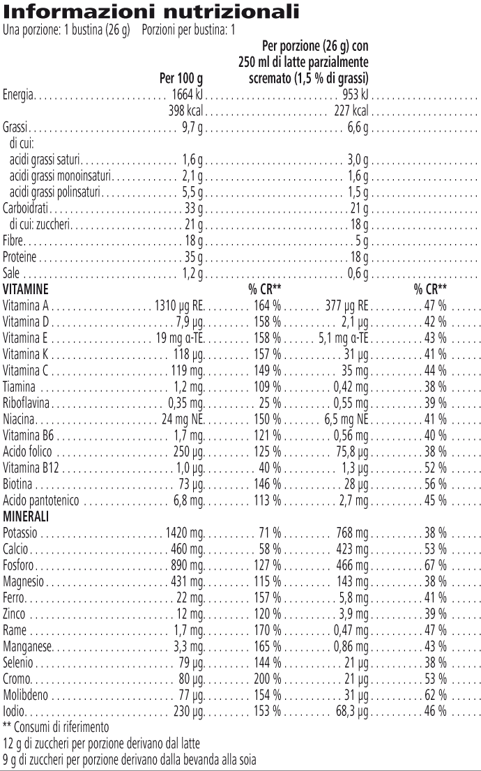 Durante la pausa pranzo, ti basterà versare il contenuto della bustina nel contenitore, aggiungere 250 ml di acqua o latte (potrai anche scegliere il latte di soia, più digeribile rispetto a quello tradizionale), e shakerare il tutto, per avere in pochissimi minuti il tuo gustoso frullato pronto per essere consumato.